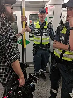 Authorized security officers carry a grey uniform labelled ordningsvakt, and have the authority to use force. They patrol nightclubs, shopping malls, festivals and city centres. Security staff without special authority have the badge väktare.
