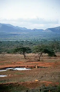 Tsavo West has an arid, hilly landscape, dotted with volcanic cones, dark lava flows and a number of rocky outcrops. It is bisected by the park's namesake, the Tsavo River.