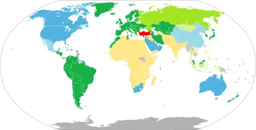 - Central and South America and the Caribbean: Argentina, Belize, Bolivia, Brazil, Chile, Colombia, Costa Rica (30), Ecuador, El Salvador, Guatemala, Honduras, Nicaragua, Paraguay, Peru, St Kitts and Nevis, Trinidad and Tobago, Uruguay, and Venezuela.