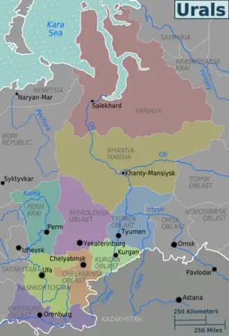 The Urals (Russian: Ура́л oo-RAHL) is a common geographical name of the area of Russia around the Ural Mountains. It is a vast territory which includes major cities like Yekaterinburg and Chelyabinsk, as well as parts of the polar areas. The Ural mountains are among the oldest mountains on Earth and are generally not very high, more often looking like large hills, though there are some taller ones, too. Travellers to Urals should not miss Yekaterinburg; usually it is a starting point of any trip to the Urals.